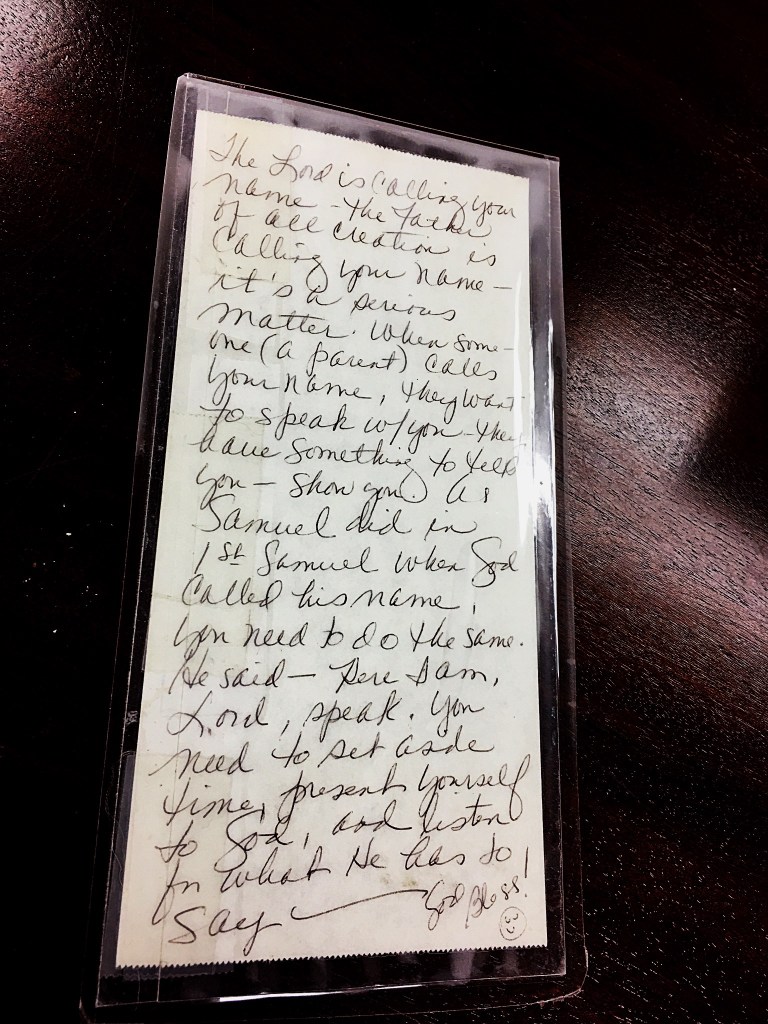 One particular work night, I had just greeted a party of three ladies. They ordered soup and I finished with my routine and stated “guys, I’ll be right back with your soup.” minutes passed and I was heading to their table and discovered my general manager standing there talking to them, nervously I gave them their soup and my boss pulled me aside. They had complained that I was treating them like men, offended because I said “guys” to them. He said he was reassigning them to my co-worker, and giving me her new table, another three ladies. I minded my p’s and q’s with them at first out of caution, but they turned out to be fun and happy. At one point, one of them said to me, “you’re going to think I’m crazy, but God wants to talk to you the way a Father wants to talk to his son.” I stood there stunned, feeling the tears begin to come forth and I fought it while responding to her, “you’re not crazy.” I knew that I knew this was God moving and I went to the side station and got paper from the register, approached her, and asked if she would write down the message.